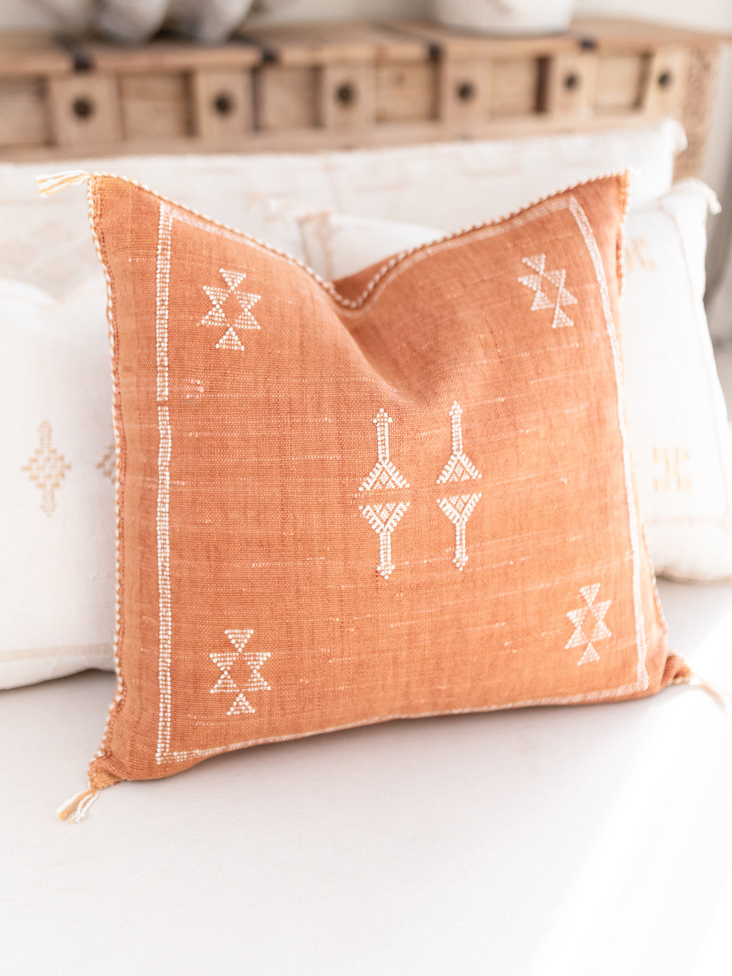 Each cactus silk cushion cover is made by hand on a traditional wooden loom, then individually faded to perfection under the Moroccan sun, giving a gorgeous tonal detail and depth to every piece.