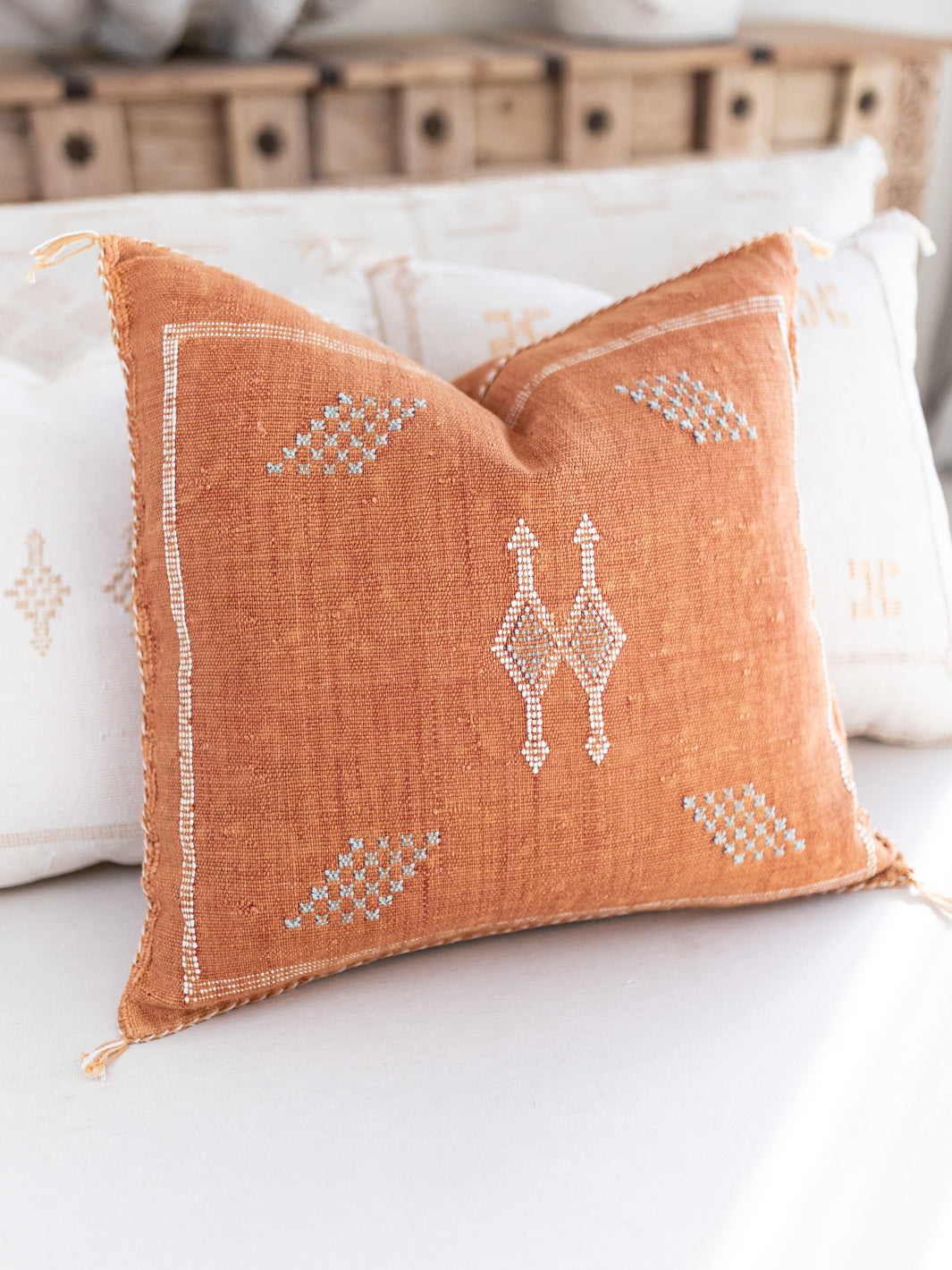 Each cactus silk cushion cover is made by hand on a traditional wooden loom, then individually faded to perfection under the Moroccan sun, giving a gorgeous tonal detail and depth to every piece.