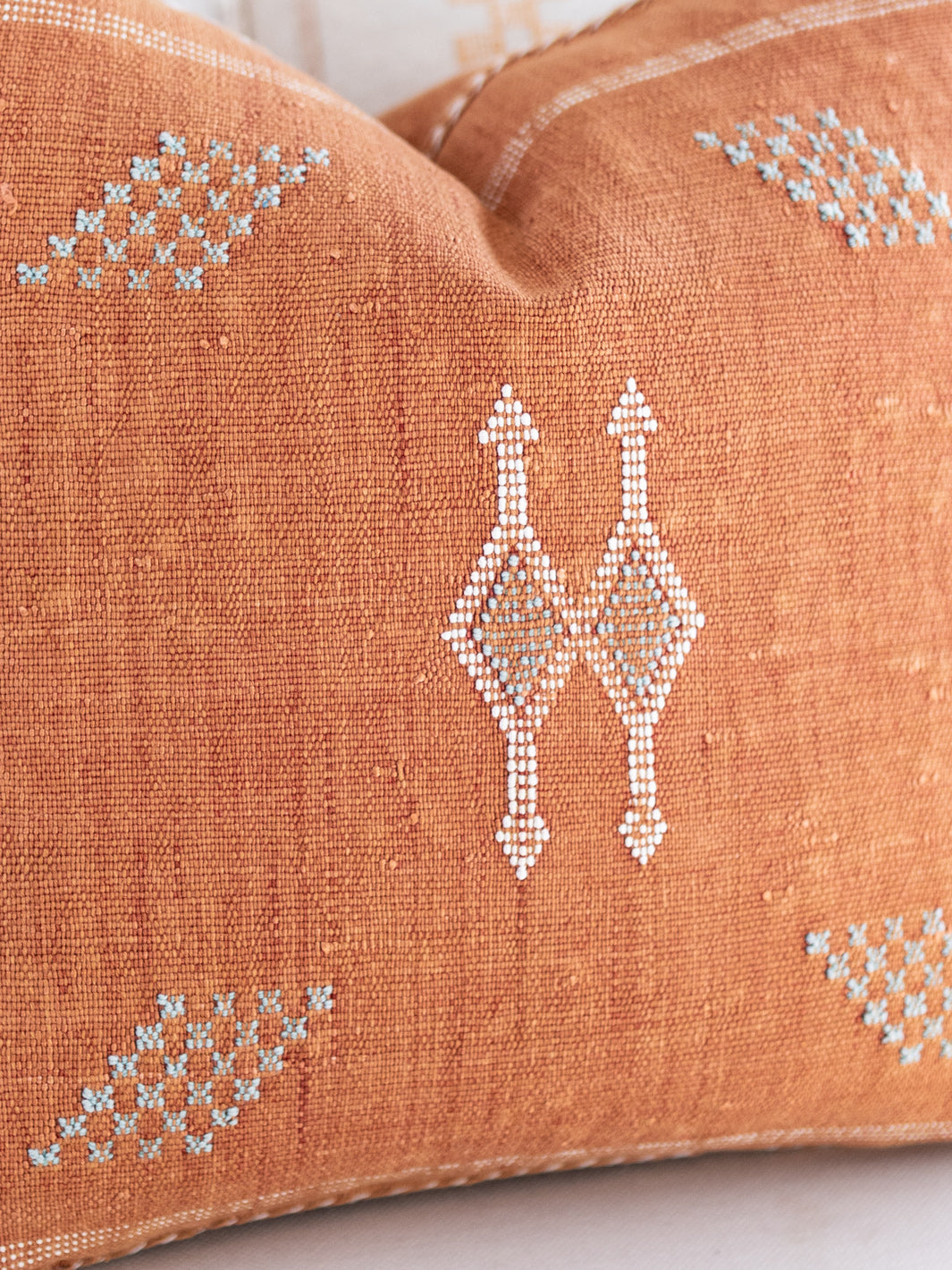 cactus silk cushion in terracotta with blue and white stitching
