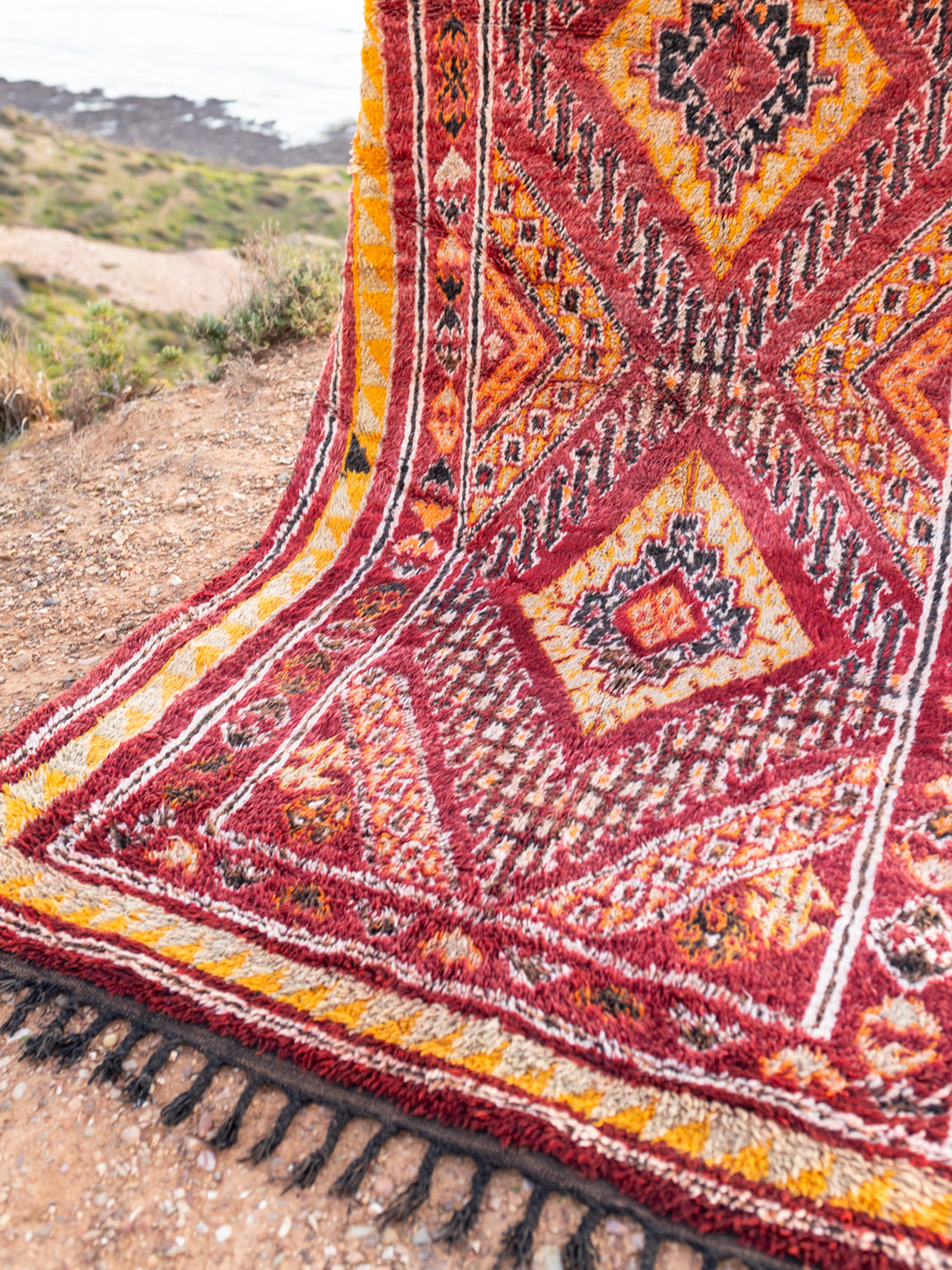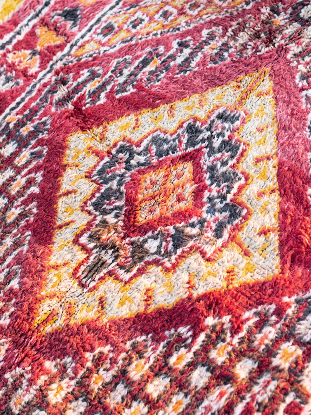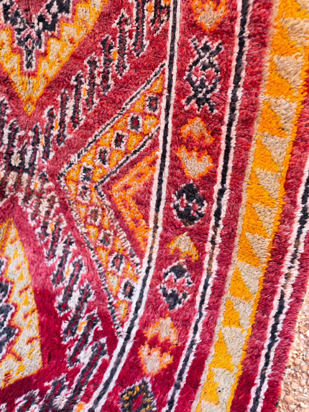 Vintage Moroccan rug in rich colours of burgundy, red, black and yellow