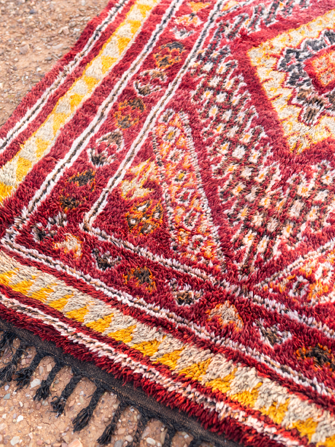 Rugs of this vintage and quality are hard to find. Made by skilled craftswomen many decades ago (we estimate it was crafted in the mid-century), this rug is well cared for, and in truly excellent condition. It is beautifully weighted with neat, dense knotting and gorgeous original tassels. It features a medium pile and is lovely and soft under foot. The wool carries a subtle lustre which speaks to the high quality of the virgin wool, sourced from the Atlas mountains many years ago and naturally dyed with deep jewel-like hues.
